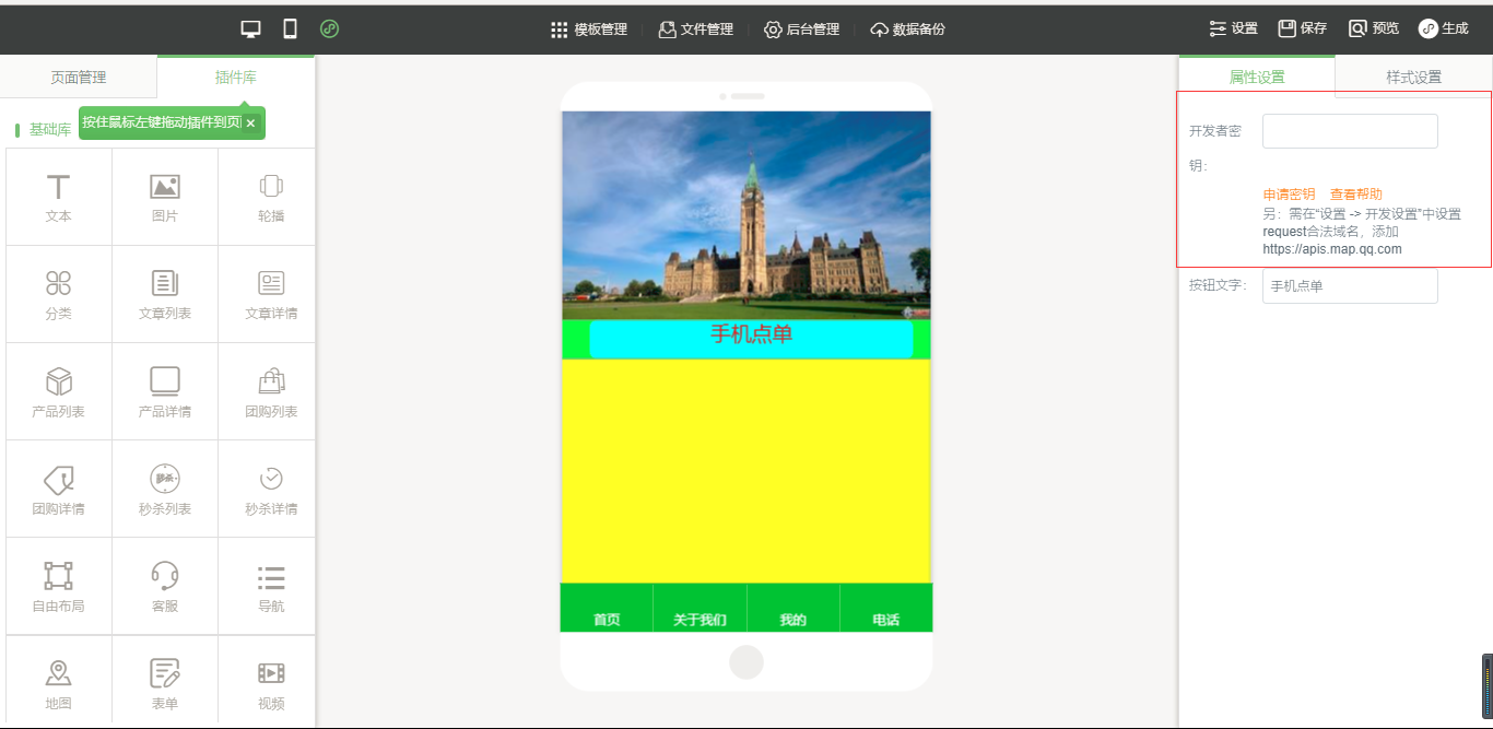 3.在小程序编辑器中,拖入插件“手机点单”,该插件为内页插件,我们可以在页面中给小程序页面进行布局,然后点击“开始点单”按钮进行属性及样式设置,由于需要店面的准确定位,因此需要申请地图的API密钥,具体操作可以看帮助文档,在样式设置中,“背景设置”与“边框设置”是全局设置,是针对该小程序插件页面的整体设置,“按钮样式”则是仅针对于“手机点单”入口按钮的设置;“列表(页面)设置”是针对该菜品列表页的设置,里面的“文字设置”中可以设置需要的显示项,设置完成之后点击保存即可(注:当后台没有添加任何数据时,该列表页中会出现一组假的数据,仅供参考使用,当后台添加数据之后,该列表会自动换成真实数据),如图所示: